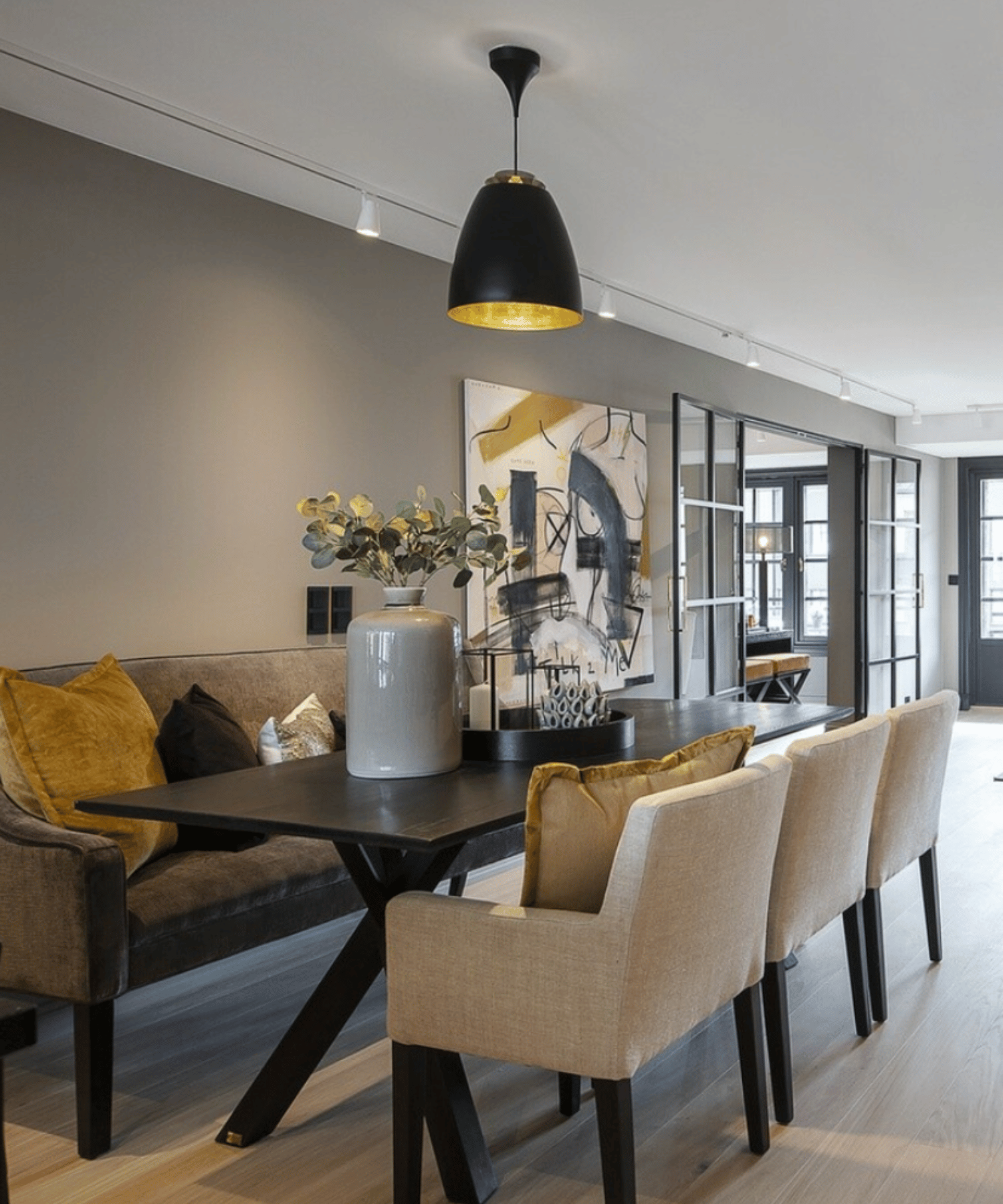 Lumière et décoration : Un éclairage soigné, combinant différentes sources lumineuses (lampadaires, suspensions, lampes à poser), crée une ambiance chaleureuse et accueillante. Quelques objets décoratifs choisis avec soin, comme un miroir, une sculpture ou une œuvre d'art, personnalisent l'espace.